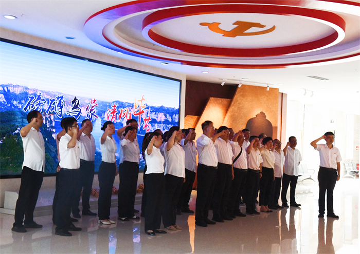 参观结束后,全体党员面向党旗庄严肃立,重温入党誓词,叩问入党初心。“我志愿加入中国共产党……”铿锵有力的誓言回荡在展厅内,表达了党员干部们坚守初心、忠诚担当的坚定信念。