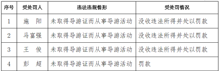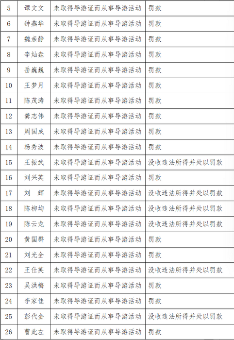 | 为进一步规范旅游市场秩序,加强导游队伍管理,维护游客合法权益,2025年以来,省文化和旅游厅持续深入开展“导游乱象”集中整治行动,坚决打击未取得导游证而从事导游活动以及欺骗或胁迫旅游者消费、向旅游者兜售物品、擅自委托他人代为提供导游服务、私自承揽导游业务、擅自增加旅游项目或变更接待计划、未及时申请变更导游证信息等各类违法违规行为,其中,因未取得导游证而从事导游活动被依法查处的有26人,根据《中华人民共和国旅游法》《导游人员管理条例》等法律法规,现将2025年以来因未取得导游证而从事导游活动被依法查处的人员相关信息予以公告。 一、因未取得导游证而从事导游活动被依法查处的人员相关信息 二、相关提示 1. 旅行社要进一步加强管理。全省各旅行社要切实履行主体责任,加强对导游人员的日常管理和培训教育。严格规范导游执业行为,杜绝类似违法违规行为发生。建立健全内部监督机制,定期对导游服务质量进行评估和考核等。 2. 导游人员要进一步加强自律。广大导游人员要引以为戒,自觉遵守法律法规和职业道德规范。不断提升自身业务素质和服务水平,为游客提供优质、诚信的导游服务,共同维护旅游行业良好形象。 3. 各级文化和旅游部门要进一步加强监督检查。全省各级文化和旅游部门将持续加大旅游市场监管力度,增加监督检查频次,拓宽投诉举报渠道。对违法违规行为“零容忍”,坚持“两个决不”,发现一起、查处一起,决不姑息迁就。同时,加强与公安、市场监管等部门的协同合作,形成监管合力,共同维护全省旅游市场秩序。 欢迎广大游客和社会各界对旅游市场进行监督,如发现违法违规行为,请及时拨打贵州省政务服务热线“12345”进行投诉举报。 贵州省文化和旅游厅 2025年9月5日 |