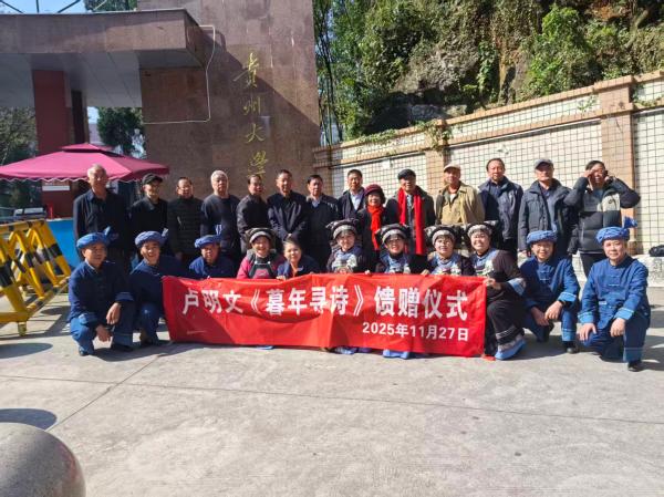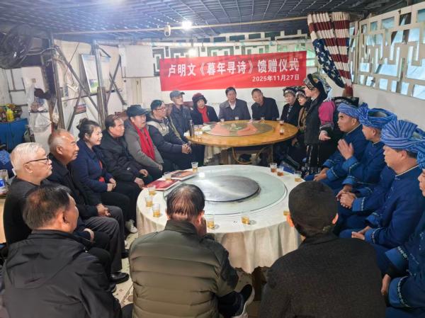 | 11月27日上午,贵阳花溪区贵州大学农学院门前的一餐厅内,卢明文先生《暮年寻诗》一书发放仪式在筑举行,卢明文先生身为布依族诗人,暮年仍怀赤心、笔耕不辍,以诗为媒定格岁月风华,既藏乡土温情、民族韵味,亦含老者对生活的热忱与对文字的坚守。《暮年寻诗》字字凝情、句句见真,既是先生个人诗意人生的鲜活印记,更是布依文化与乡土文脉的生动传承,为诗文界添彩,为后辈创作者立范。 发放仪式上,贵州省农业农村厅原机关党委书记郑传楼满怀激情的对《暮年寻诗》一书进行了高度评价,他说卢老师的《暮年寻诗》不仅丰富了自己的生活内容,也抒发了对美好生活的向往与追求。同时也给子女留下丰富的文化精神财富,他的这一举动,是树立文化自信的具体体现,值得我们大家学习。树立文化自信,是关乎国运兴衰、文化安全和民族精神独立性的重大战略问题,其意义在于为中华民族伟大复兴提供更基本、更深沉、更持久的精神力量。作为贵州人,一定要有五个自信:一是文化自信,贵州出了尹真,出了张之洞,李端芬等名人;二是科技自信人,天眼在贵州,航空航天在贵州;三是政治自信,1921年,在嘉兴南湖红船上参加召开党的笫一次代表大会中,又有贵州人邓恩铭,1945年,陪同毛泽东、周恩来在重庆同蒋介石谈判的了个人中,又有贵州人王若飞,代表国民党与日本签订日本投降书的。又是贵州人何应钦,遵义会议确定了毛主席在全党的领导地位,从此中国革命翻开了崭新的一页,遵义便成为中国革命的转折之城;四是生态自信,贵州是世界公认的旅游大省,先后12次在贵阳召开了世界性的生态文明论坛会。近年来,来贵州旅游的人,每年以十五个百分点的速度递增,成为井喷式的旅游发展。凡来贵州旅游的人的共同感受是:山水还是贵州好,看了一眼忘不了。常来贵州爬爬山,脸上不会长雀斑。多来贵州淋淋雨,脸上不长青春王米。贵州菇娘不用夸,亮丽赛过牡丹花,贵州男女不用说,英俊智慧赛诸葛;五是发展自信,全省县县通高速,西部第一省,全国第6位,为贵州后发赶超,创造了基础条件。台湾人来贵州的表述是,他们30年前,学深圳,30年后学贵州。因为台湾还有两人个县未通高速。外国人来贵州的表述是,贵州的隧道和高架桥是世界的博物馆,全世界又高又长的高架桥有11座,其中8座在贵州,刚通车的花江高架桥,长1400米、高625米,居世界第一。 贵州省布依族学会副会长、著名作家韦安礼高度评价郑书记的点评,认为对《暮年寻诗》的点评上升到了一个哲学的高度,他还讲述了与卢明文老友的深厚友谊,指出《暮年寻诗》的文学价值,与会的三十多个嘉宾均进行相关点评,对《暮年寻诗》进行了高度评价。 编辑:汤 华 责编:马晓椿 编审:张雪莲 |